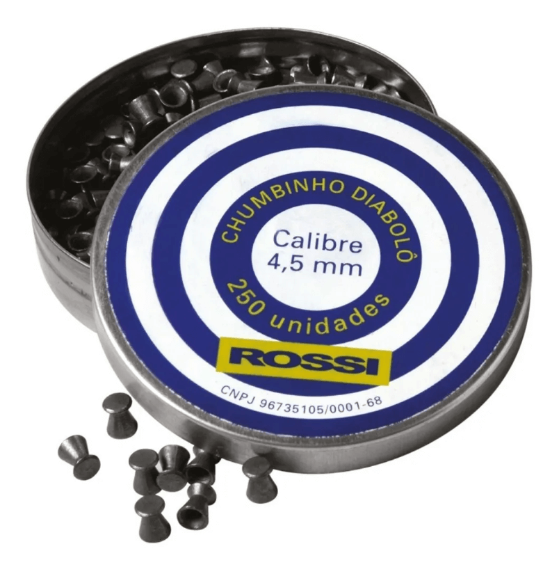 Chumbinho Rossi Diabolô 4,5mm (.177) 0,53g para Tiro ao Alvo – Lata com 250 chumbinhos. Usos Indicados: Chumbinho para carabina de pressão Chumbinho para espingarda de pressão Chumbinho para pistola de pressão Chumbinho para revólver de pressão Confeccionado com material leve proporcionando mais velocidade no tiro. Possui corpo médio com cabeça achatada tipo Match. Proporciona ótima precisão, excelente agrupamento e por isso é indicada para treinamento esportivo ou mesmo para o lazer. Especificações Técnicas Marca: Rossi Modelo: Diabolô Calibre: 4,5 mm (.177) Quantidade: 250 unidades Composição: Liga de chumbo Embalagem: Lata Peso: 0,53g Conteúdo da Embalagem – Chumbinho Rossi Diabolô 4,5mm (250 unidades) Garantia do Fabricante Garantia Rossi de 3 meses contra defeitos de fabricação.